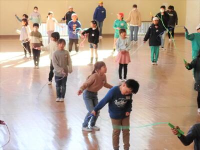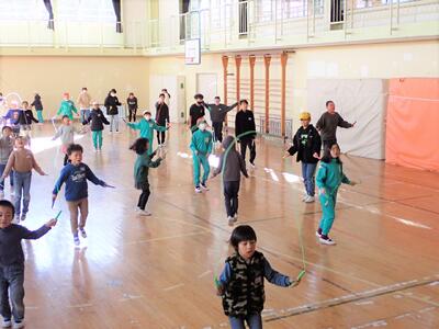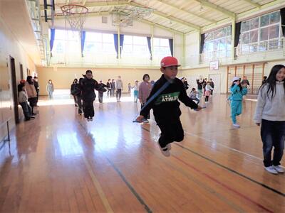 持久走が終わり、なわとびが始まりました。1・2年生ですが、あや跳びや