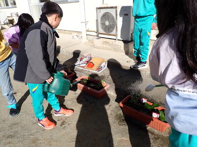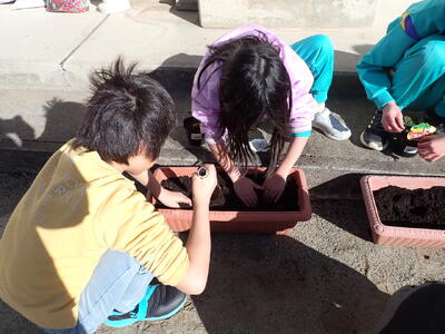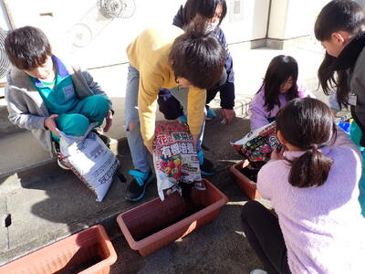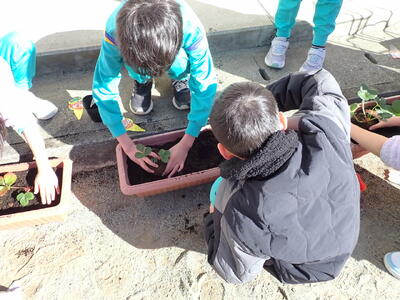 3年生が、総合的な学習の時間に、地域の特産物である「いちご」の苗植えをしていました。