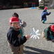 風にも負けず、紙コップで作った風車を回しに校庭に飛び出しました。