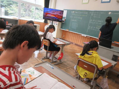 6校時には、5/6年生に中学校の様子スライドを作り紹介してくれました。