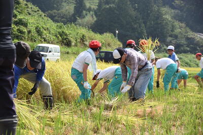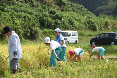 9月中旬とは思えない暑い日でしたが、5年生が稲刈りを行いました。