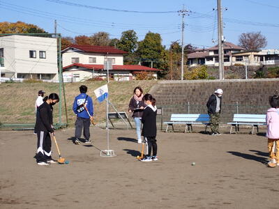 子供たちは、朝のうち河川敷でグランドゴルフ大会に参加しました。中学生と