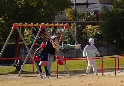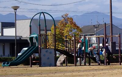 中央公園の遊具と芝生で、休み時間。