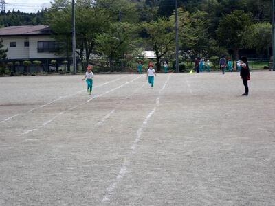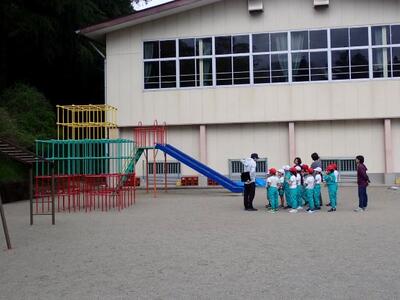 短距離走の結果で、運動会の班分けを決めるそうですよ。後半は、遊具の使い方について教えてもらっています。