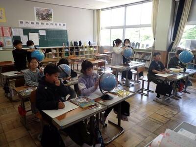 5年生は社会。今日も地球儀を使った授業です。昨日は緯度と経度について学んでいましたが、今日は距離について学んでいます。
